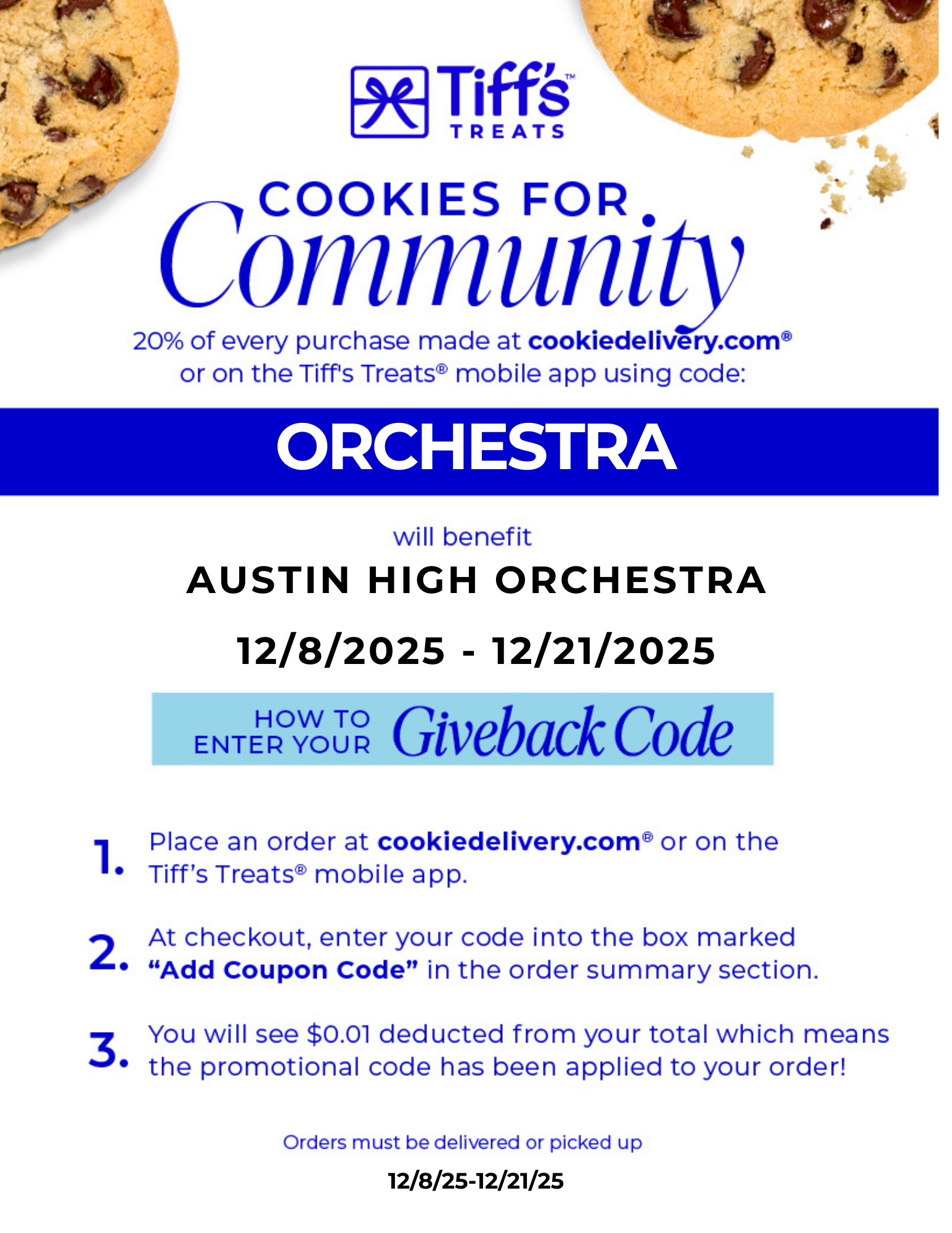 The orchestra relies on adult volunteers for different events throughout the year. If you are interested in volunteering or know you will be volunteering in the orchestra room and helping students, please submit an application on the AISD Voly site. Also check out our volunteer webpage for additional info.